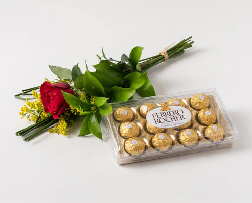 Um presente especial para uma pessoa especial. Este lindo arranjo com uma rosa solitária vermelha envolvida em Ruscus, Tango e acabamento em ráfia acompanha deliciosos bombons Ferrero Rocher ou similares.